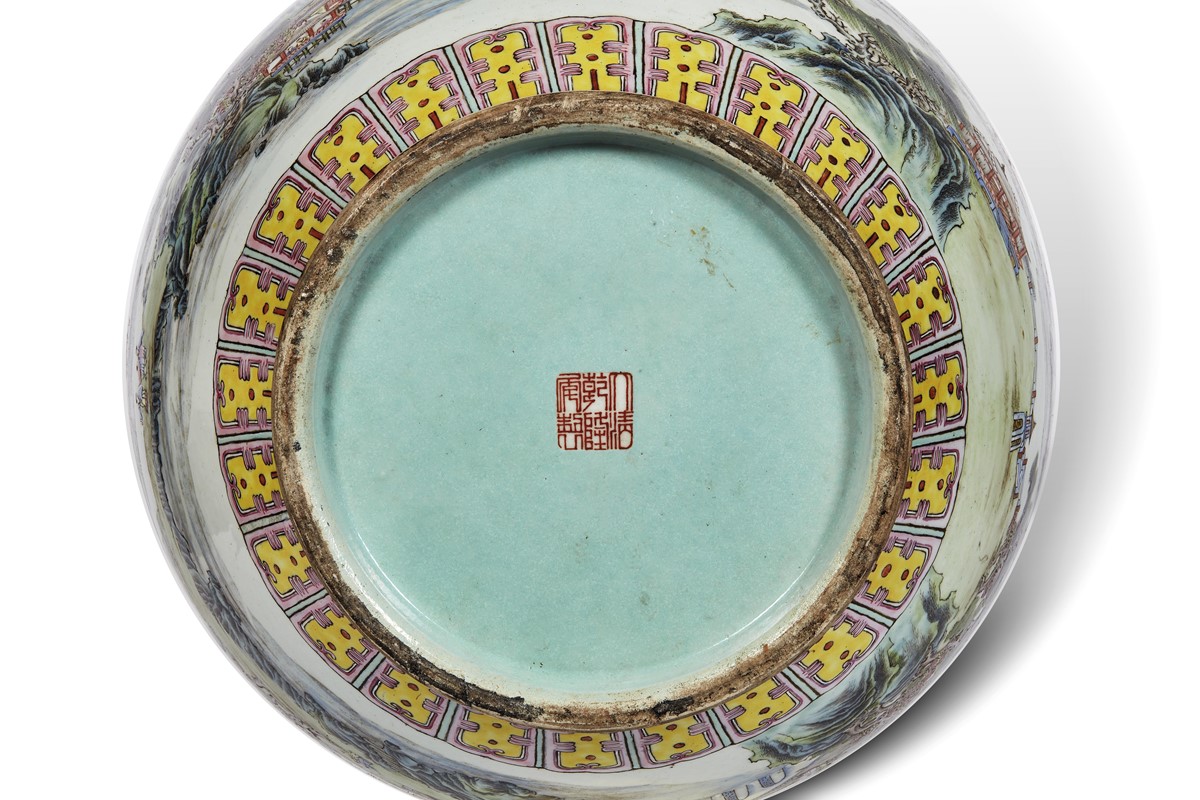 主题纹饰为通景山水楼阁图,描绘了在远山近水、亭台楼阁、水光潋滟,庭桥流水、洞石松柏花卉之间,众多的文人墨客闲庭信步其中,观景,对诗,泛舟,相协而行,一片雅致祥和。主题纹饰的上边饰粉彩如意云头纹,下边饰黄地如意方瓣纹。足上饰青花回贯折纹一周。足内施粉绿釉,署矾红篆书“大清乾隆年制”六字三行款。