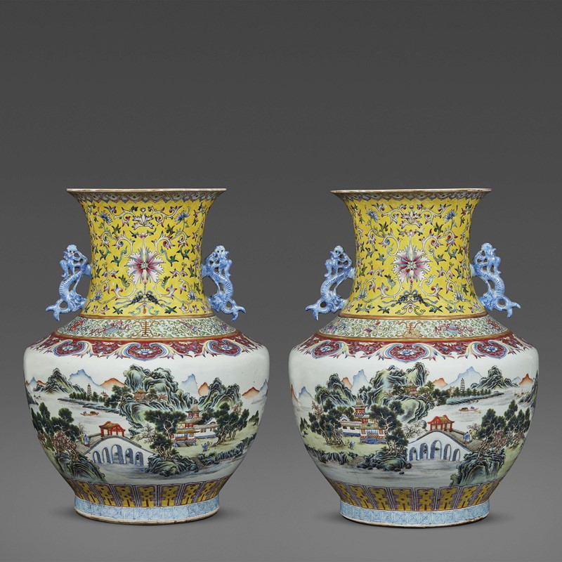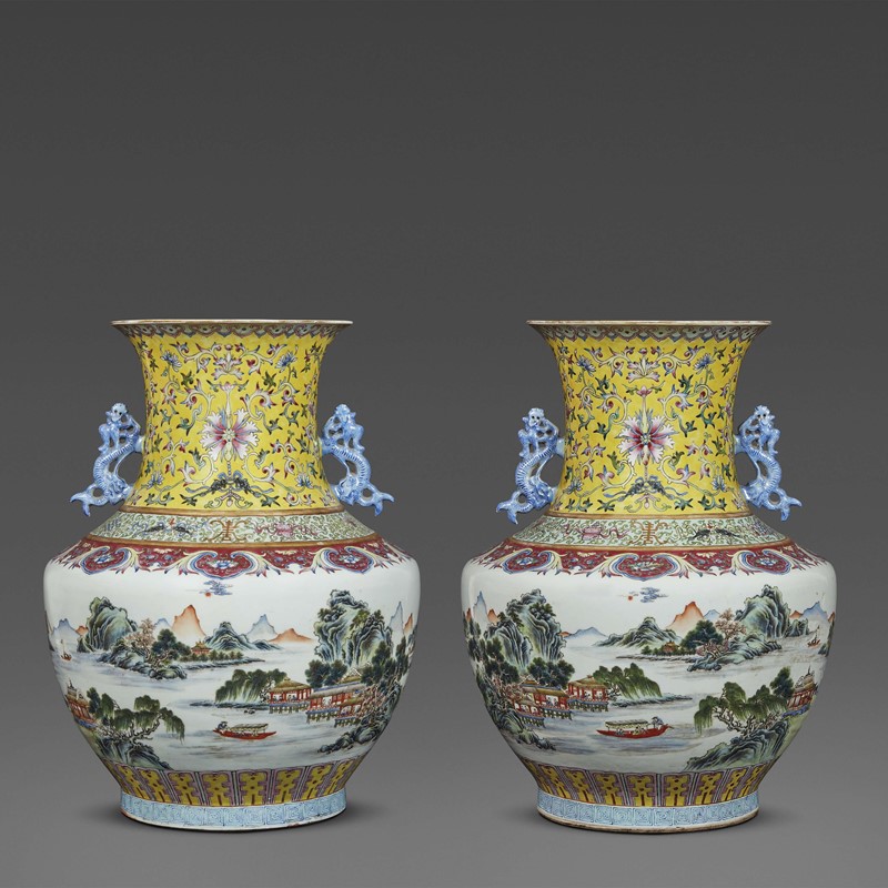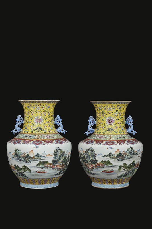 清 十九世纪 黄地通景山水楼阁图龙耳尊一对