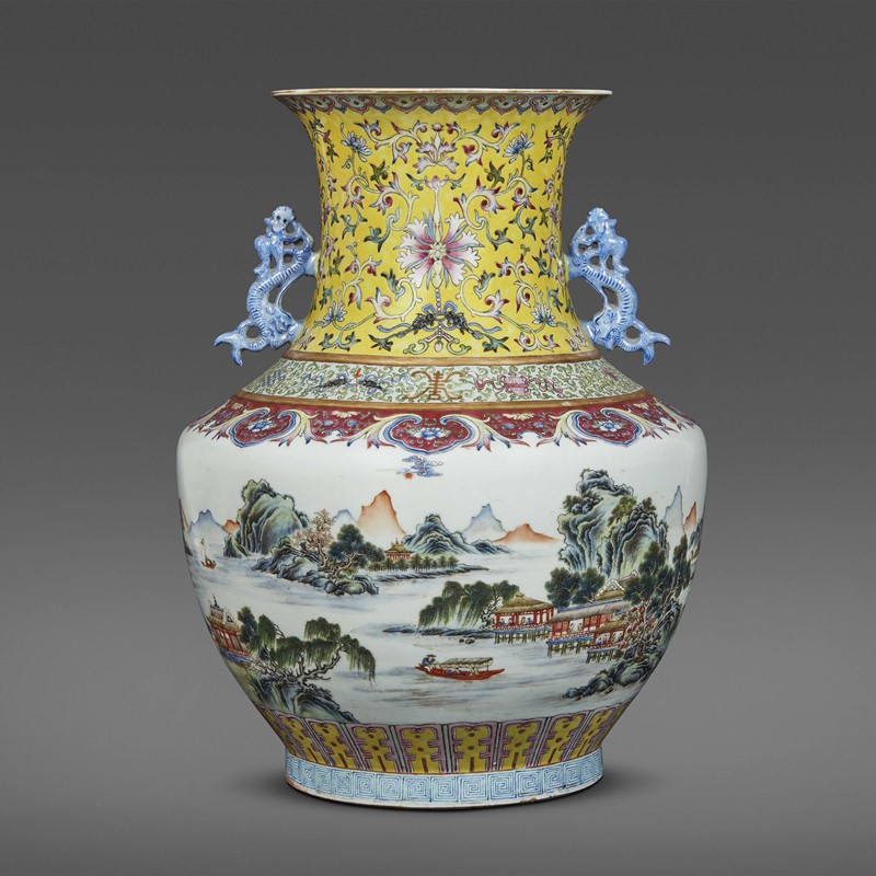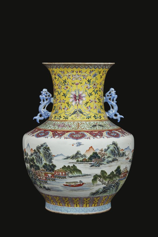 polychrome porcelain famille rose HU-shaped, finely painted vase with mountain and lake landscape, open bulidings, trees and a bridge with people crossing it. Above the landscape there are brunches and leaves framed by ruby red Ruyi heads. The belt on the neck, within gilt cartouches, is decorated with the “eight treasures” decorative motif and lucky-charm ideograms. On the neck, enameled in yellow there are freely painted flowers, branches and leaves; blue dragon-shaped handles. Marked Qianlong under the base.