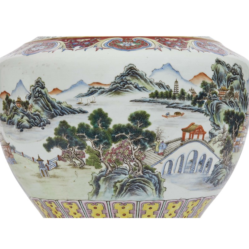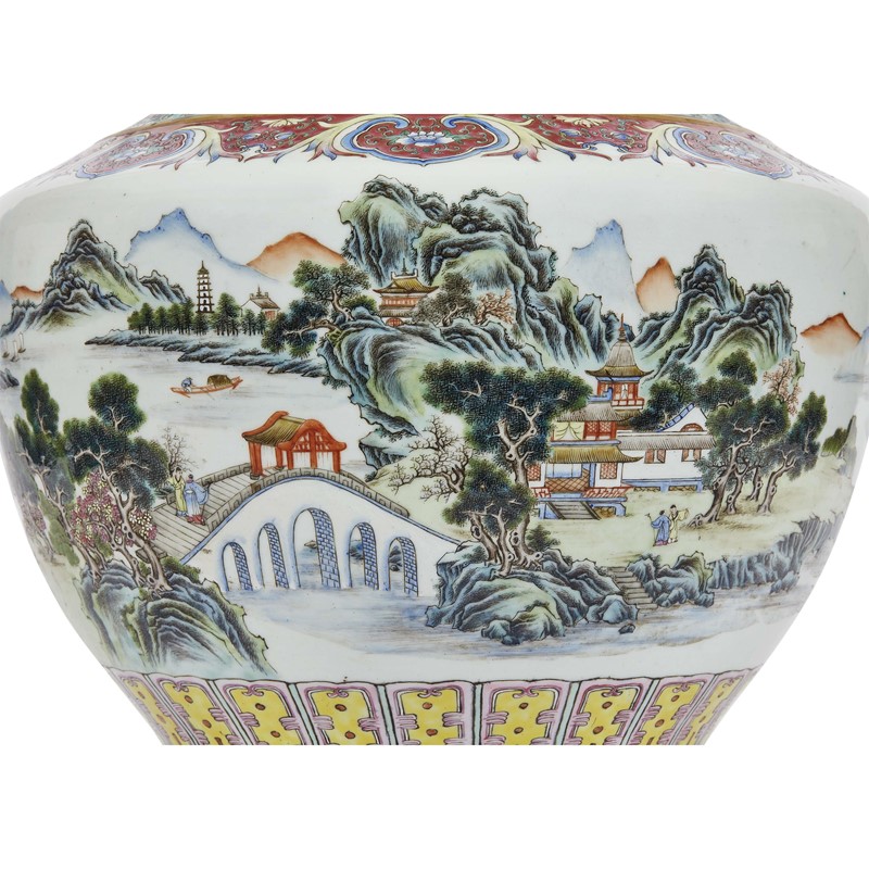 di forma “HU” in porcellana policroma della famiglia rosa, finemente dipinto a tutto tondo con paesaggi montuosi, edifici, alberi, lago e un ponte con persone che lo attraversano, sopra il paesaggio ci sono teste di ruyi in rosso rubino che fanno da riserva a fiori e foglie.