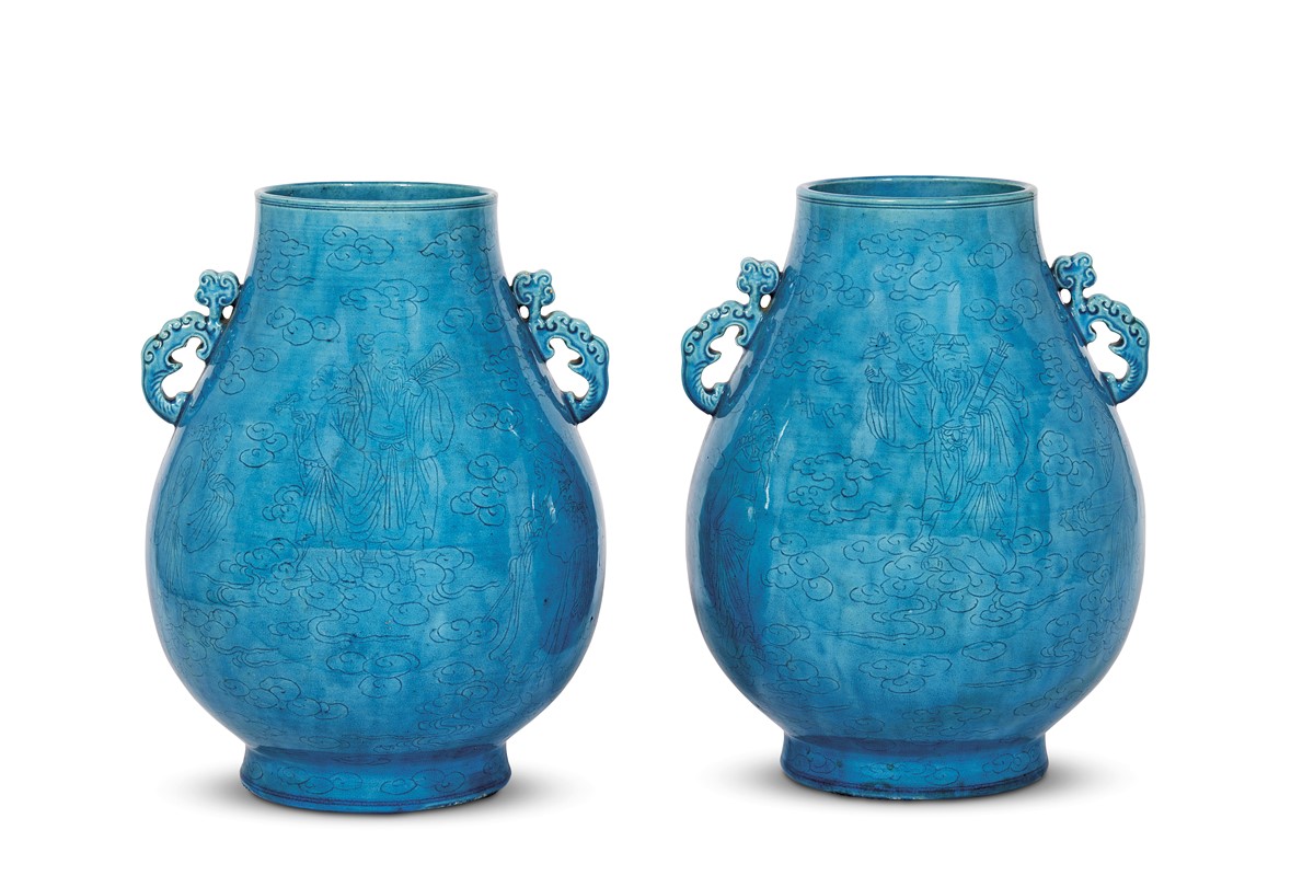 COPPIA DI VASI, CINA, TARDA DINASTIA QING, SEC. XIX-XX in porcellana color turchese, di forma “Hu” incisa con gli otto immortali fra le nuvole. Alt.cm 33 清 十九至二十世纪 孔雀蓝釉龙耳尊一对