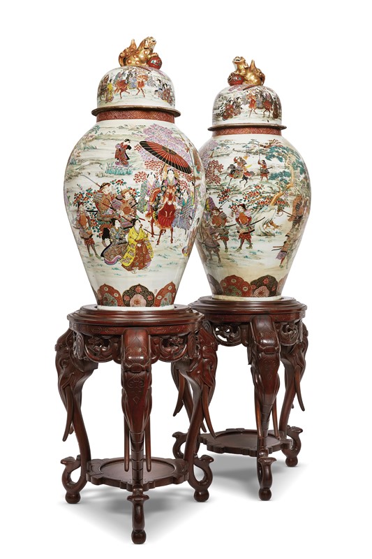 日本 十九世纪 九谷烧游园巡猎图盖罐一对