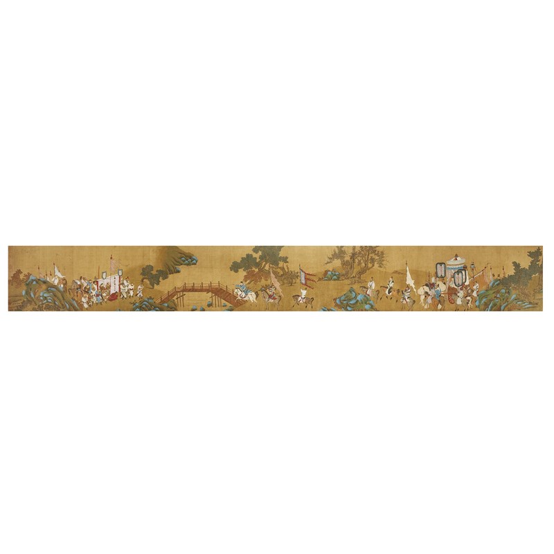 in seta raffigurante battaglia sul ponte lungo con cavalieri e bandiere
