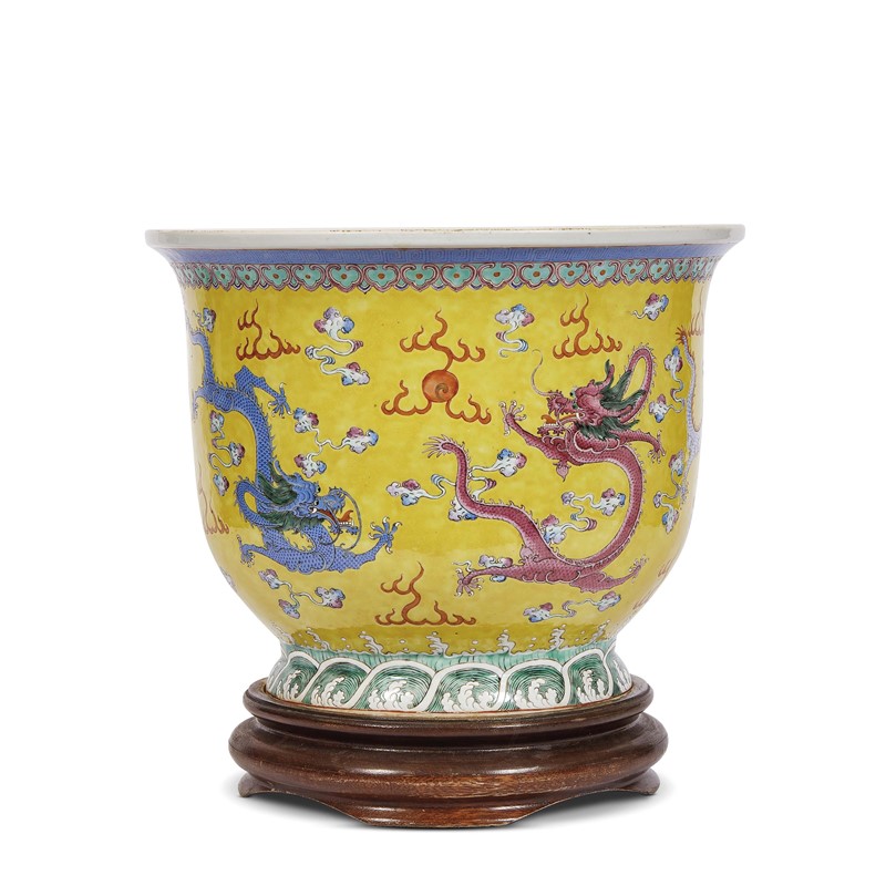 清 十九世纪 珐琅彩明黄地龙戏珠纹缸