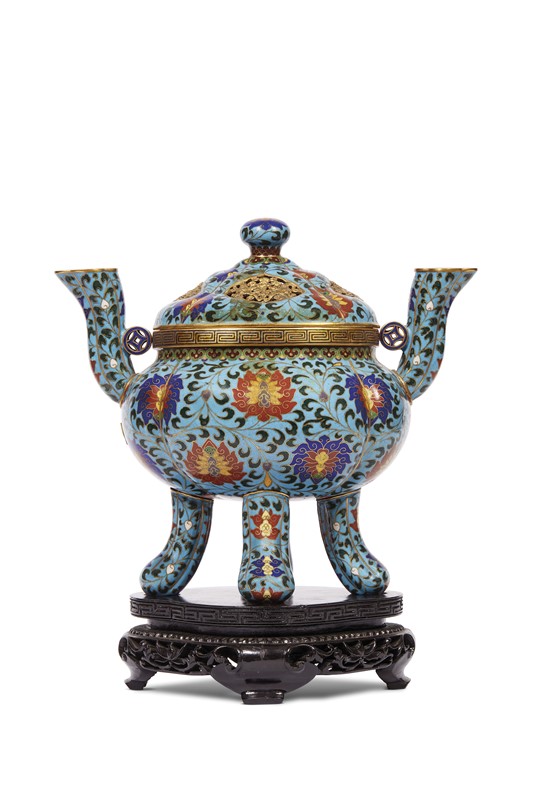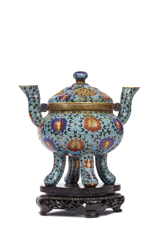 INCENSIERE CON COPERCHIO, CINA, DINASTIA QING, SEC. XIX-XX in cloisonné di forma tripode decorato con fiori e volute. Alt.cm 24 senza base 清 十九至二十世纪 铜胎掐丝珐琅缠枝莲纹香炉