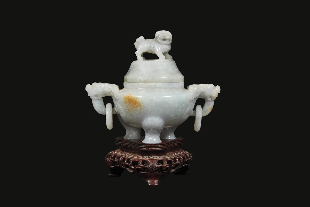 INCENSIERE TRIPODE, CINA TARDA DINASTIA QING, SEC. XIX-XX in giadeite color verde pallido e russet, due orecchie a forma di animali con anello, coperchio con presa a forma di leone. Alt.cm 8 清 十九至二十世纪 沁红翡翠兽衔环耳玉香炉