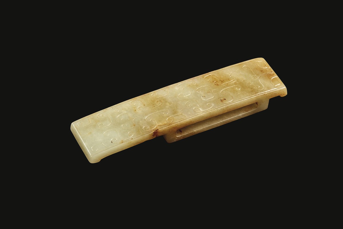 in giada bianca Hetian a forma di Dai con modello Gu a rilievo.