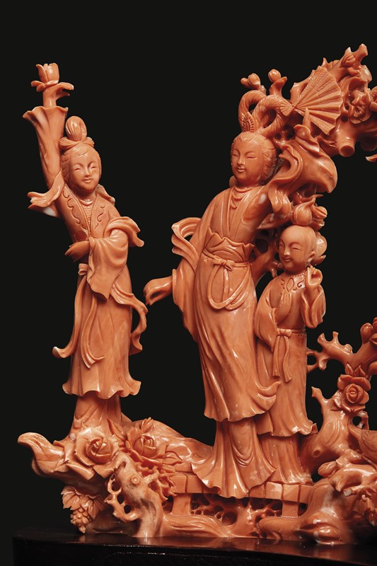 清 十九世纪 珊瑚雕梅花仕女童子摆件