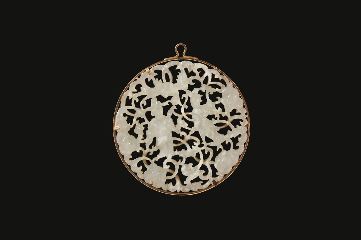 in giada bianca traforata e lavorata con personaggi, rami e foglie.