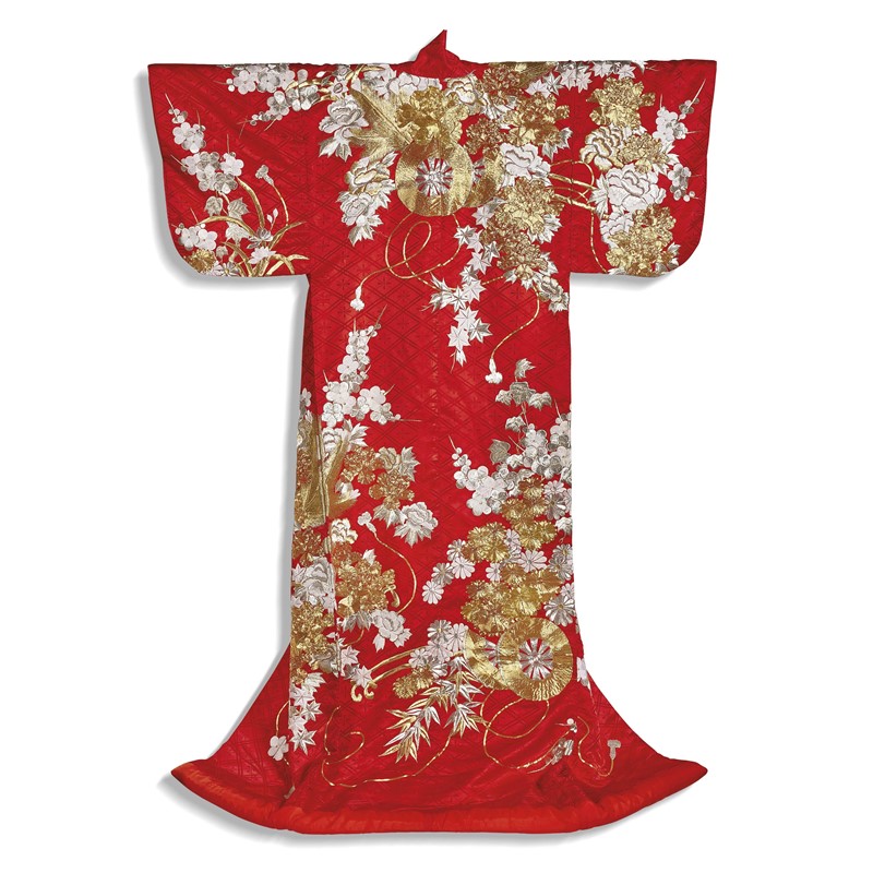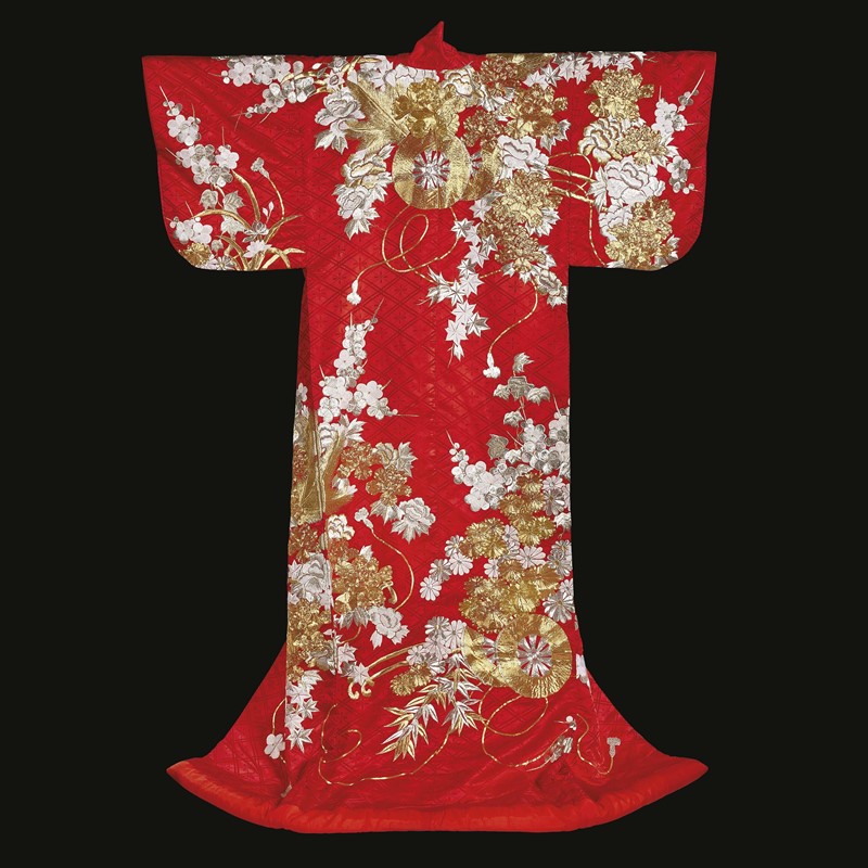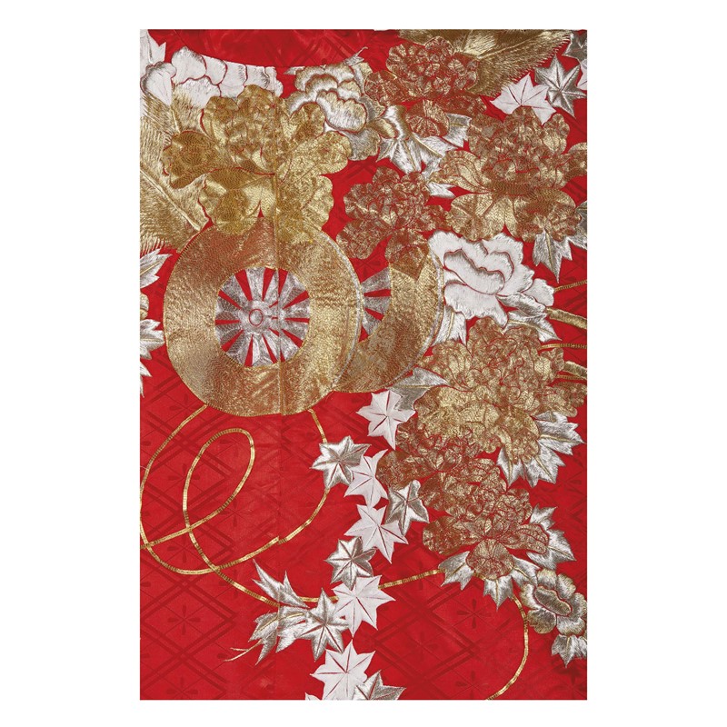 日本 江户 1615至1860 缎红地暗格纹金银绣丹梅菊叶轮图 打掛うちかけ和服