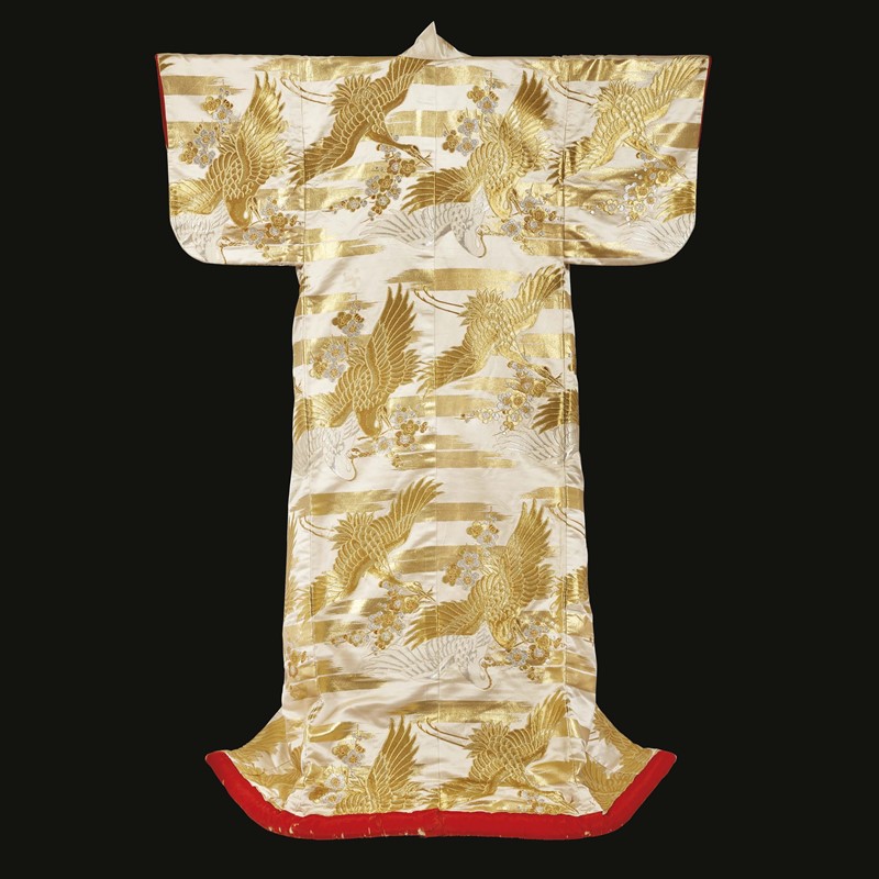 日本 江户 1615至1860 缎練金色地金银绣云鹤梅图 打掛うちかけ和服