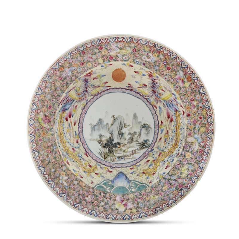 in porcellana policroma decorato nel centro con un paesaggio montano, da due fenici e sul bordo da l mille fiori e insetti.