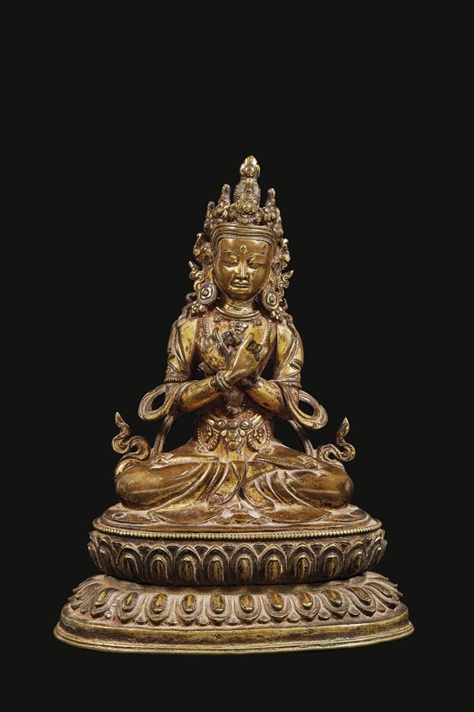 SCULTURA, CINA, DINASTIA MING, SEC. XV in bronzo dorato raffigurante buddha seduto in dhyanasana su una base doppia a fior di loto, le braccia incrociate e le mani tengono campana e vajra, le lunghe orecchie portano grande orecchini circolari. La corona e gli ornamenti della veste sono costituiti da foglie. Alt.cm 21 明 十五世纪 青铜鎏金佛坐像