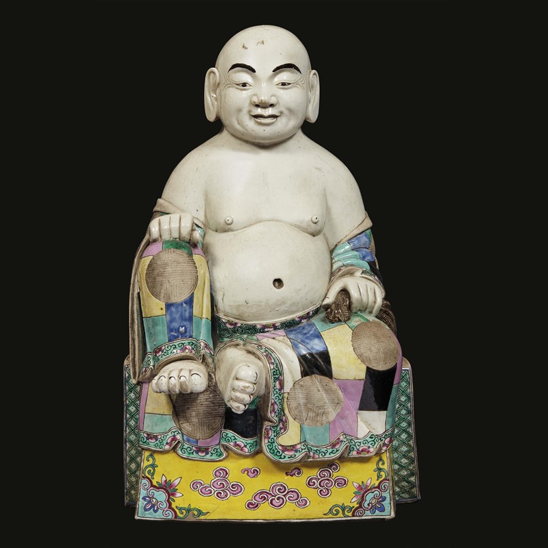 in biscuit raffigurante Budai seduto, veste policroma con ideogrammi.