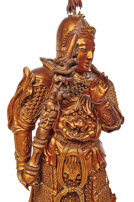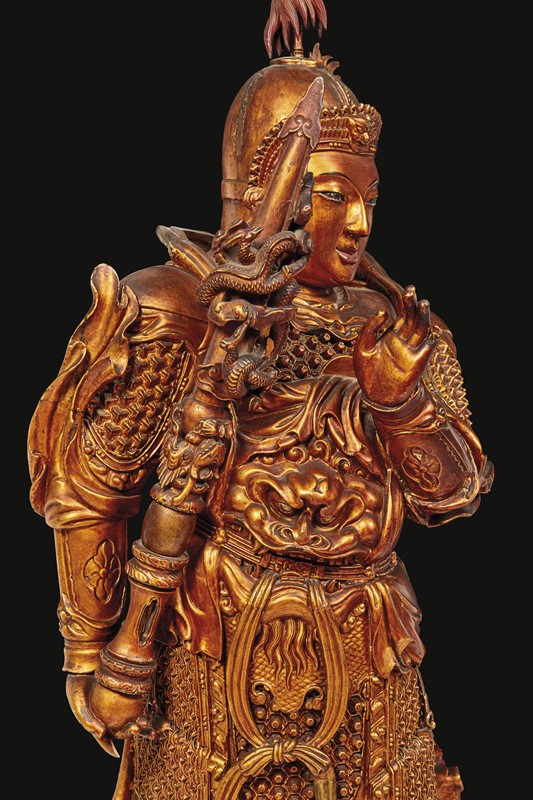 in legno laccato e dorato raffigurante Skanda, è bodhisattva Wei tuo, con corazza finemente intagliata, panneggio che cade lungo la schiena e Taotie sopra la cintura.