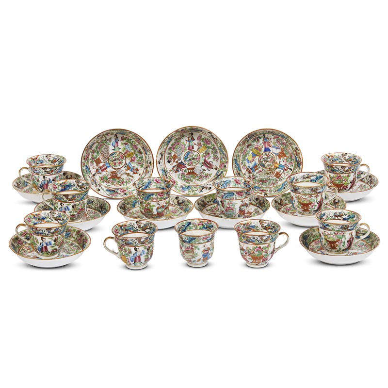 SERVIZIO, CINA, DINASTIA QING, SEC. XIX composto da undici tazzine e piattini in porcellana “Canton” decorato da figure femminili in mezzo a fiori e foglie. Diam.cm 14,5 Alt.cm 7,5 清 十九世纪 光彩开光人物故事茶碟一组十一套