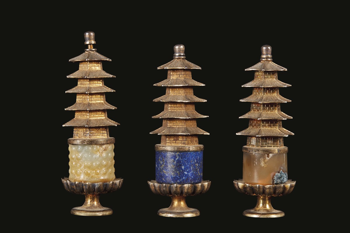 TRE ANELLI, CINA, DINASTIA MING-QING, SEC. XVII-XIX in giada, lapislazzulo e agata montati in argento con forma di pagoda. Alt.cm 11 - 12 明清 十七至十九世纪 扳指三件