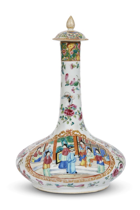in porcellana Canton a forma di bottiglia decorato con personaggi entro riserva.