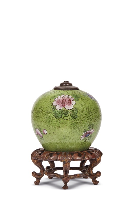清 十九世纪 绿釉暗刻花卉纹球型盖罐