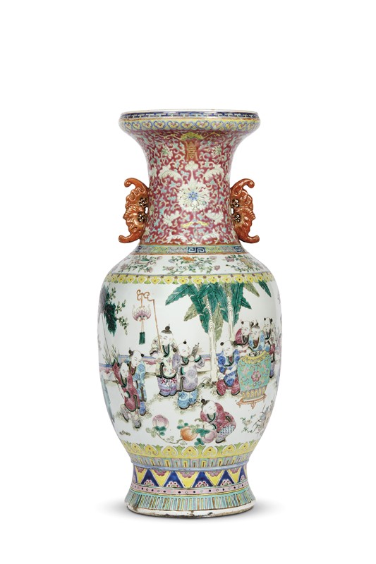 清 十九世纪 粉彩百子迎春图蝠耳瓶