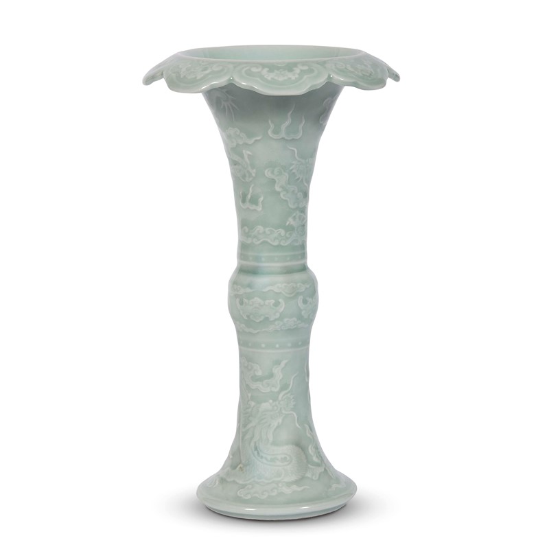 di forma “GU” in porcellana verde celadon con draghi e pipistrelli che volano fra le nuvole.