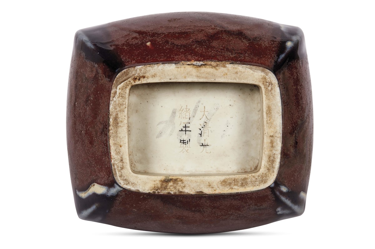 n porcellana smaltata di rosso di forma Fang Hu, sotto la base marchio inciso Quangxu.