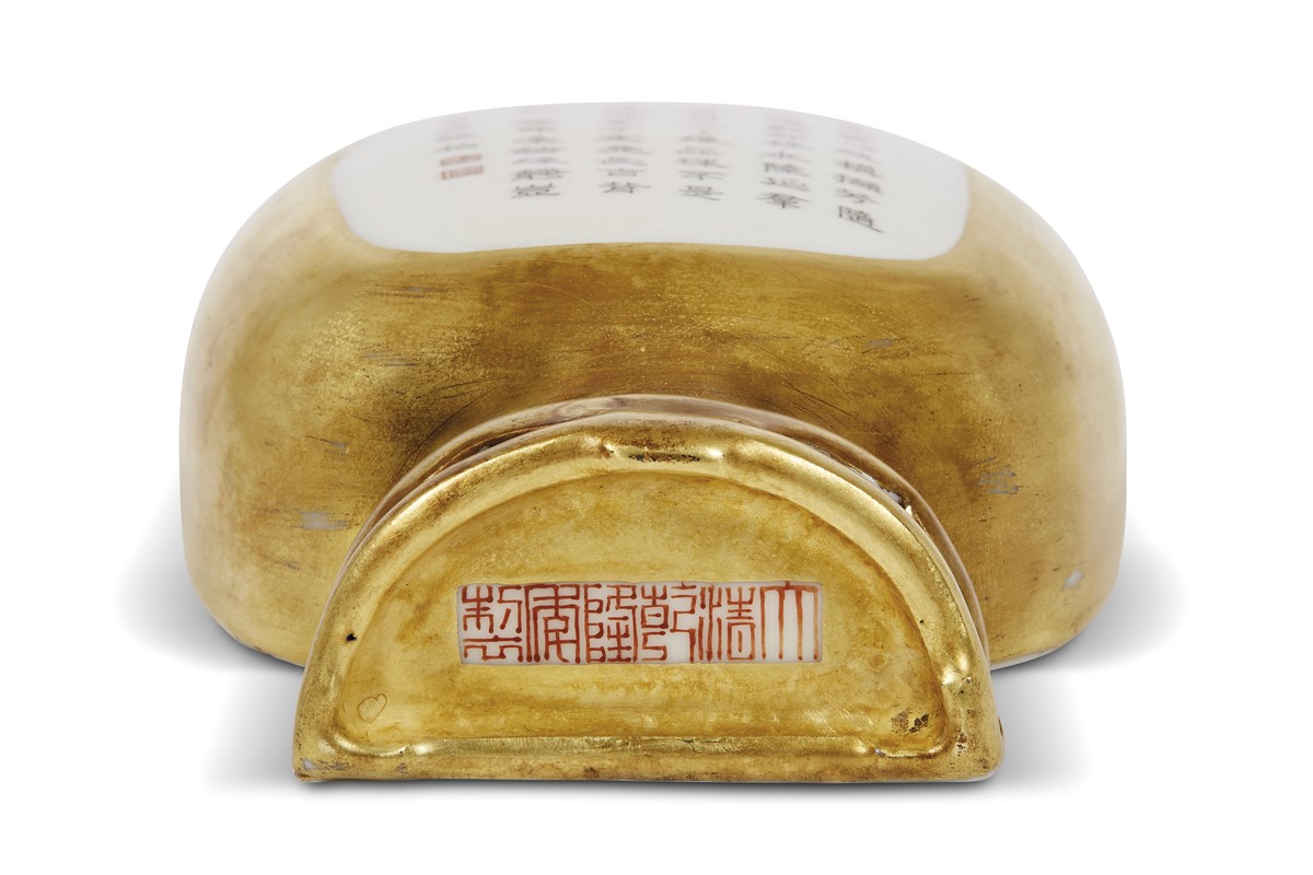 in porcellana dorata con scritte e marchi entro riserve quadrata.
