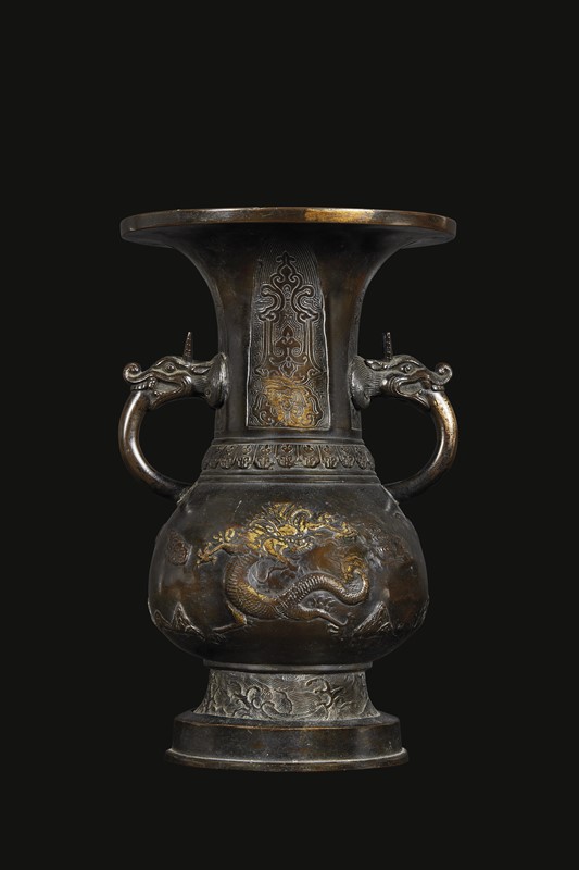 in bronzo con draghi a rilievo dorati, prese a forma di teste di drago.
