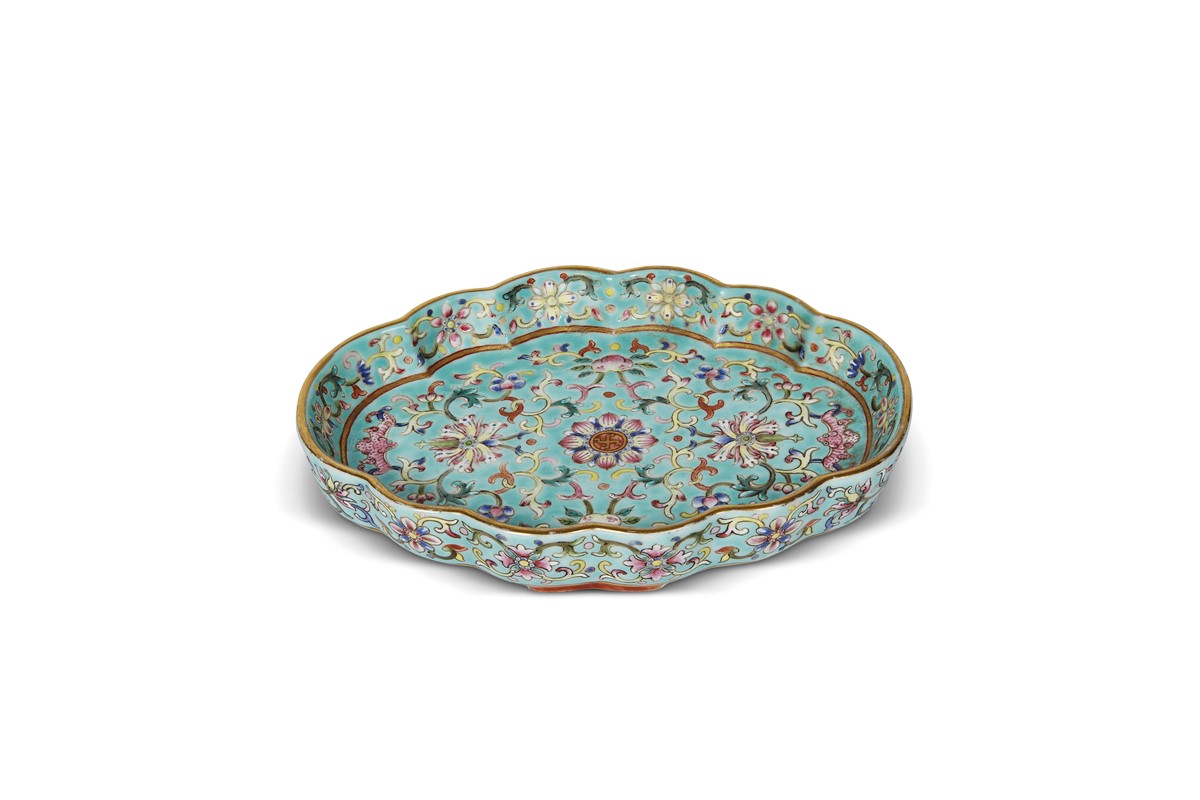 VASSOIO, CINA, TARDA DINASTIA QING SEC. XIX-XX di forma polilobata In porcellana della famiglia rosa decorato con fiori foglie e volute. Reca marchio Daoguang sotto la base. Diam.cm 15 x 12 清 十九至二十世纪 粉彩缠枝莲纹葵口洗 道光底款 1644-1912