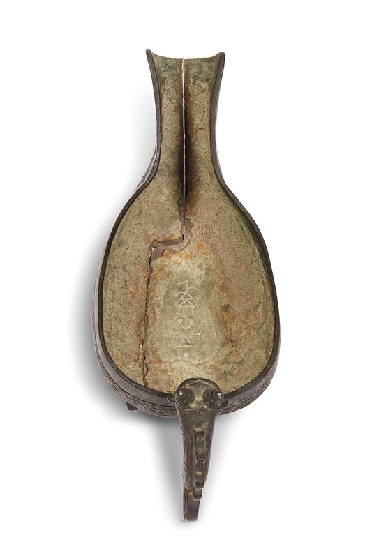 YI, CINA, DINASTIA ZHOU, SEC.XII-VII a.C. in bronzo da rituale, il corpo è supportato da quattro piedini a forma di drago, l’ansa ad anello è formata dal corpo arcuato di un drago con la bocca che morde il bordo superiore. Alt.cm 13 周 公元前十二至七世纪 龙柄铜匜 YI, CHINA, ZHOU DYNASTY, 12-7TH CENTURY B.C.
