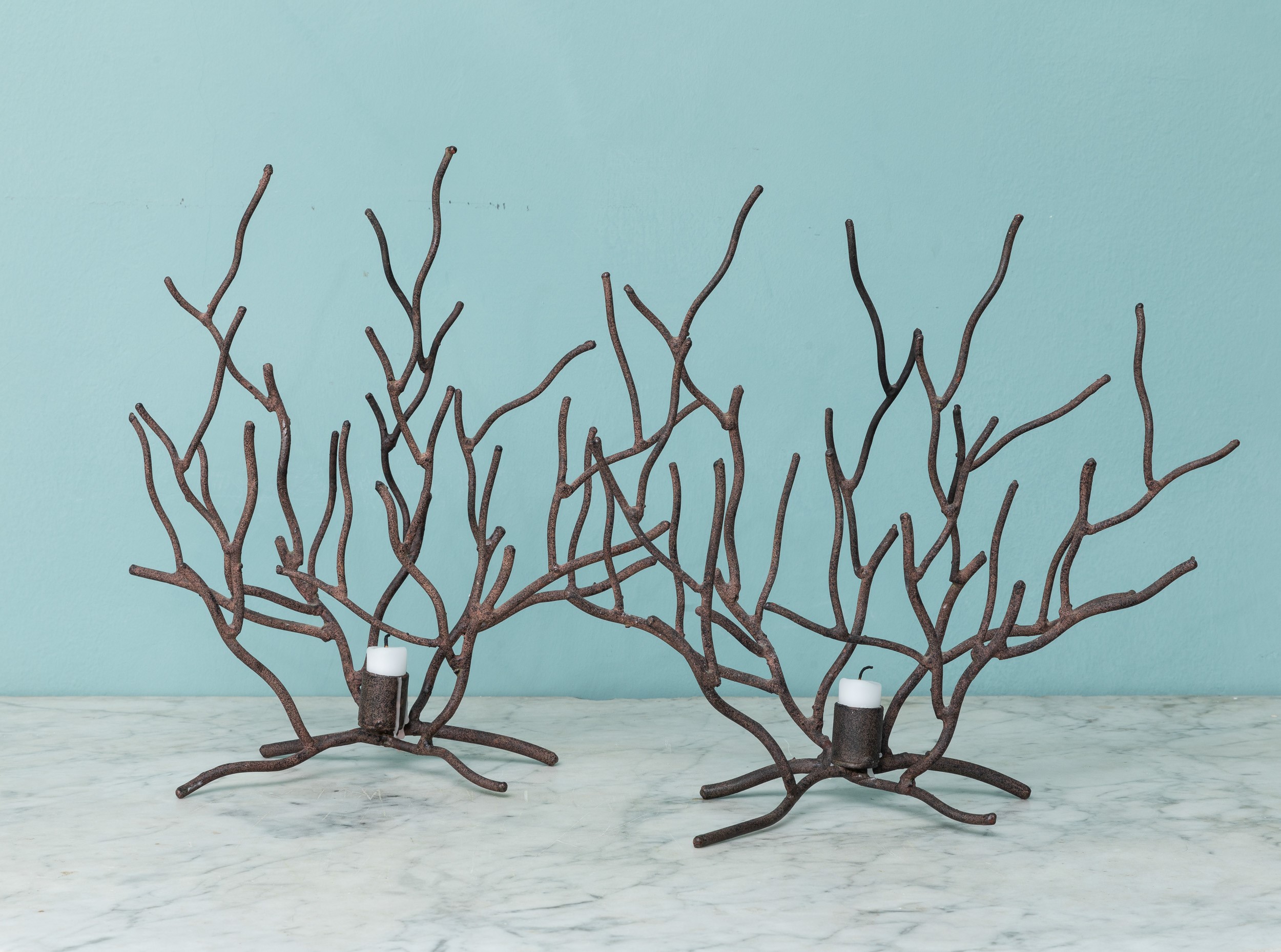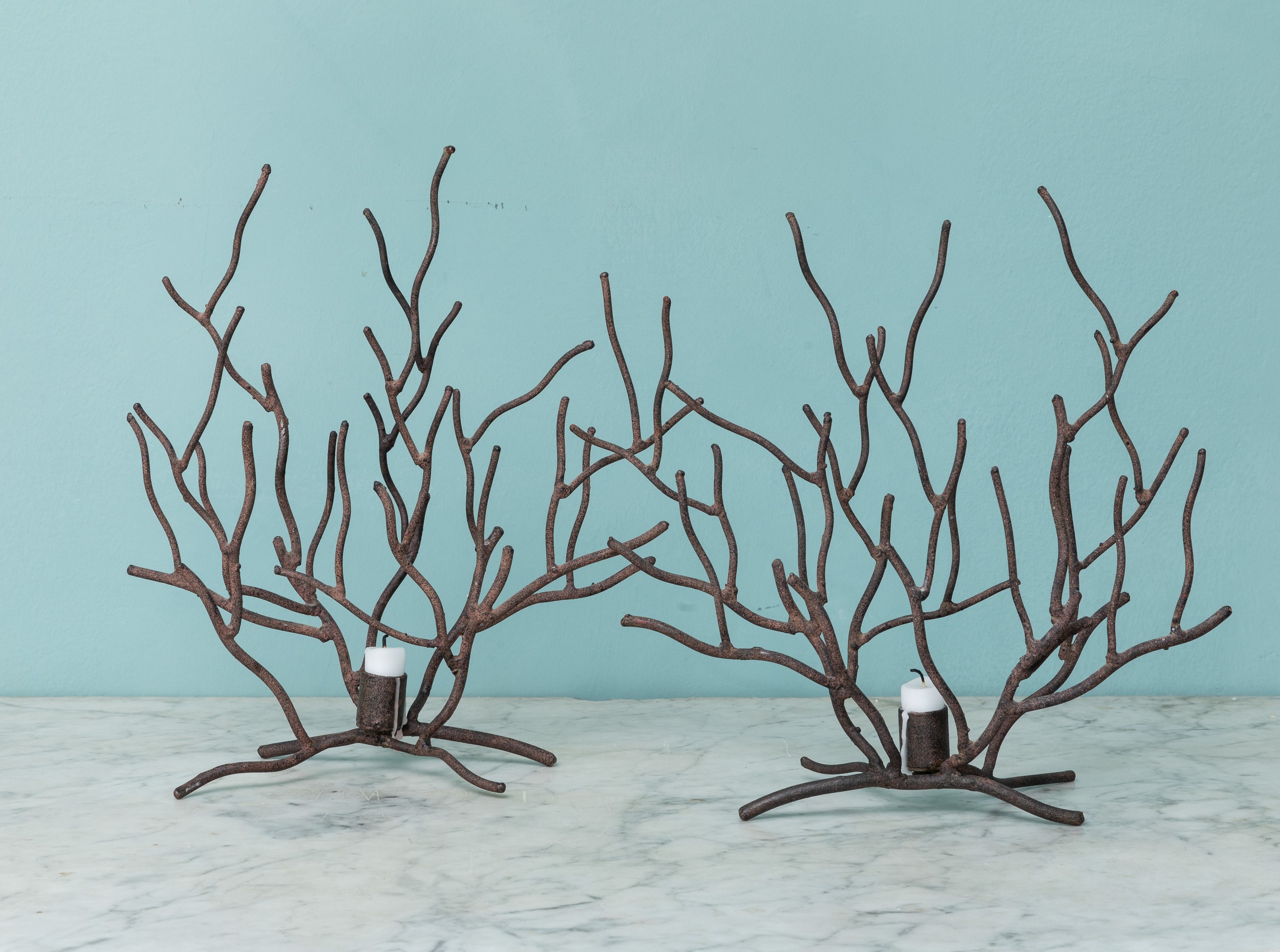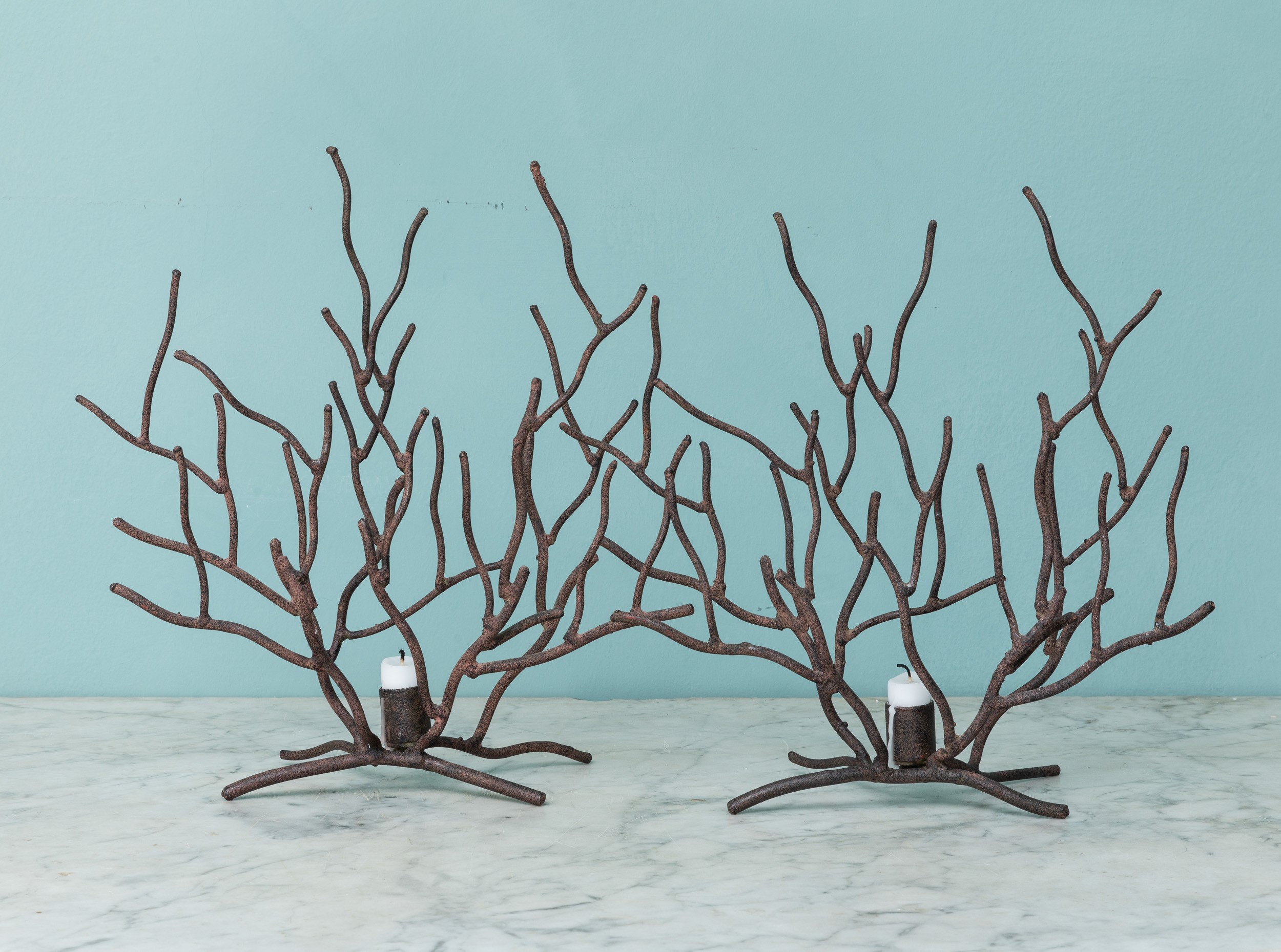 Coppia di portacandele in ferro in forma di ramo di corallo. XX secolo