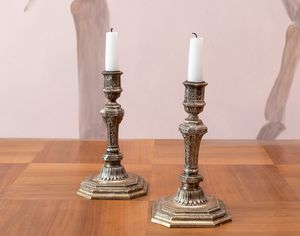 Coppia di candelieri in metallo argentato. Francia, prod. Christofle, XX secolo