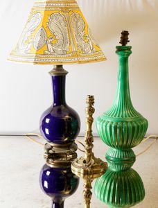 Lotto di tre lampade da tavolo in porcellana e bronzo. XX secolo