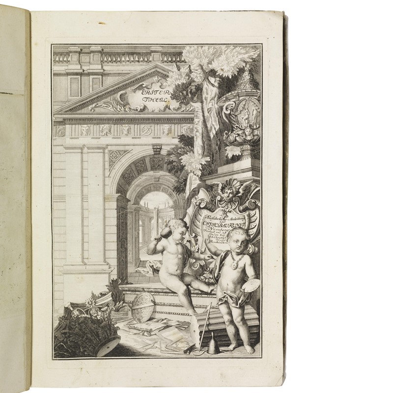 RARA SERIE DI INCISIONI ARCHITETTONICHE DEDICATA AL BAROCCO TEDESCO, di cui Paul Decker, incisore e capomastro noto anche come Paulus Decker il Vecchio (1677-1713) fu uno dei maggiori esponenti. Nulla è sopravvissuto dei suoi edifici. La seconda opera in tre parti, Ausfuhrliche Anleitung zur Civil Baukunst (“Guida dettagliata all'architettura civile”) è una magnifica galleria di 60 tavole dedicate alla decorazione di edifici privati, palazzi, chiese e strutture civiche, e contiene incisioni dettagliate di elementi di design per finestre, porte, camini, colonne, archi, modanature del soffitto, pilastri, cancelli di ferro, nicchie, altari, tombe, scale, progetti di pavimenti, facciate, prospetti e planimetrie. Le tre parti sono introdotte ciascuna da uno splendido frontespizio architettonico. La prima opera, di cui si offre qui il solo frontespizio seguito da sei piante e due vedute della seconda parte pubblicata postuma nel 1716, apparve nel 1711 con 59 incisioni, seguite nel 1713 da un’appendice con altre 40 incisioni. In esse Decker forniva progetti per un palazzo ideale, assecondando la passione edilizia dei sovrani tedeschi diffusasi nella prima metà del Seicento.