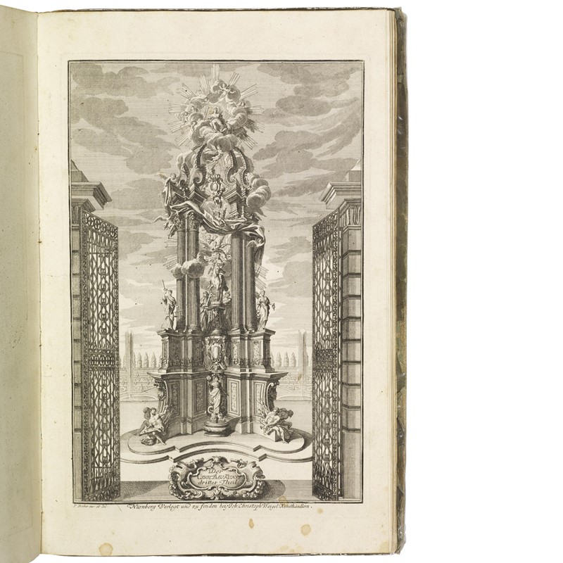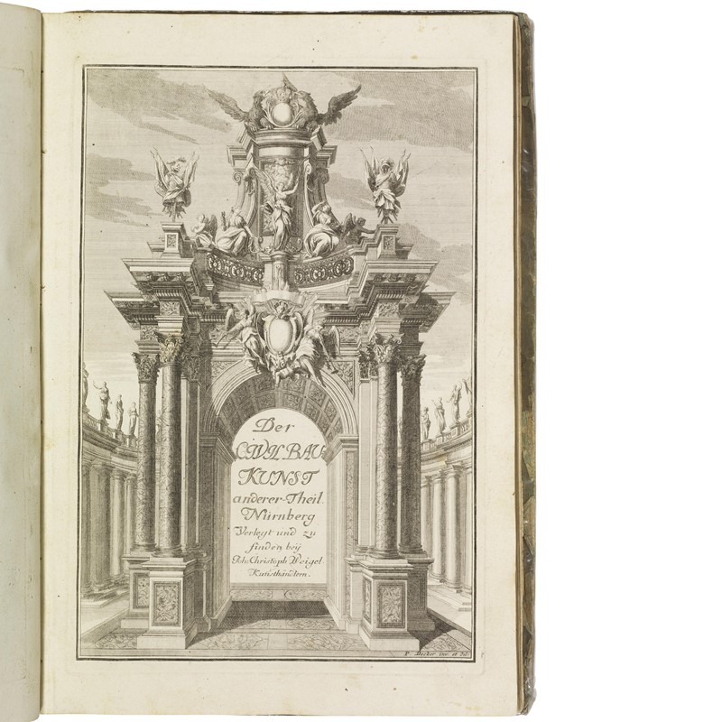 RARE SERIES OF ARCHITECTURAL ENGRAVINGS DEDICATED TO THE GERMAN BAROQUE, of which Paul Decker, engraver and master builder also known as Paulus Decker the Elder (1677-1713) was one of the major exponents. First work contains 8 (of 32) plates. The second work in three parts is a magnificent gallery of 60 plates dedicated to the decoration of private buildings, palaces, churches and civic structures; it contains detailed engravings of design elements for windows, doors, fireplaces, columns, arches, ceiling mouldings, pillars, iron gates, niches, altars, tombs, stairs, floor plans, facades, elevations and floor plans. A splendid architectural frontispiece introduces each the three parts. Detailed description and additional images upon request.