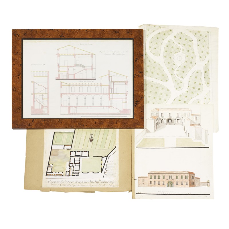 L’insieme comprende piante e spaccati di varie dimensioni acquarellati a mano, tra cui: “Impianto della Casa di Ragione di Paolo Conte Vimercati Sozzi situata in Gorlago al n. 59 Provincia di Bergamo, Distretto di Trescore” (ca. 450 x 386 mm, applicato su carta marrone); “Impianto della Casa de’ Conti Vimercati Sozzi in Caprino”; “Disegno dimostrativo del Fabbricato che il Nobile Signor Conte Paolo Vimercati Sozzi vorrebbe costruire nella propria casa in Bergamo al civico n. 1373” (con lunga nota di “Avvertenze”); “Progetto di riduzione della Casa in Bergamo del Nobile Signore Conte Paolo Vimercati Sozzi” (vari prospetti, di cui 4 incorniciati, ca. 720 x 585 mm); “Profilo e sezioni rappresentanti il piano da darsi al nuovo viale che si va ad aprire sui fondi del Nobile Sig. Conte Paolo Vimercati Sozzi conducente alla propria di lui Casa Dominicale del Comune di Gorlago” (incorniciato, ca. 560m x 410 mm); “Tipo rappresentante la planimetria del nuovo vigneto che il Nobile Signore Conte Paolo Sozzi Vimercati intende far eseguire nel proprio Brolo … in territorio della Comune di Gorlago …” (incornicato, ca. 630 x 820 mm, datato Trescore 15 ottobre 1842” e firmato “Ing. Arch. Gio. ?Rudelli”). -- I disegni non incorniciati presentano tracce d’uso ai margini.