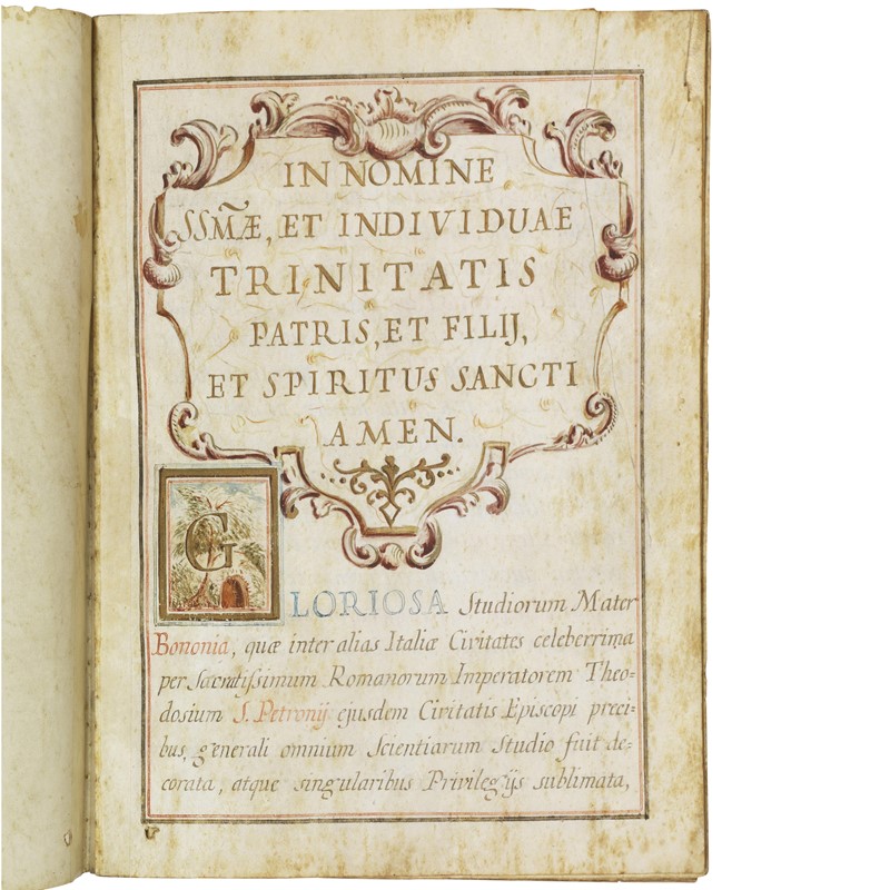 Degree in theology manuscript on vellum, issued by the University of Bologna to Florentius Antonius Sicca in November 1745. -- Restoration at the verso of the first leaf, some yellowing, some small spots, pale circular halo at the verso of the last leaf. Detailed description and additional images upon request.