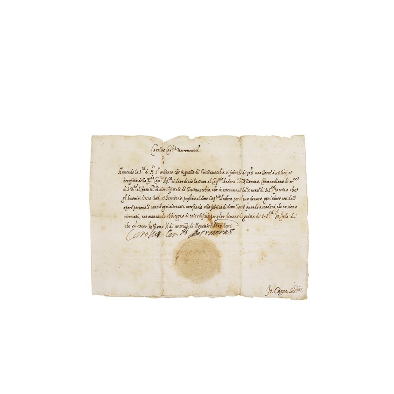 Letter signed “Carolus Car.lis Borromeus”, on a military defense topic, written in Rome on November 24, 1561, in which the Cardinal requests the inhabitants of Civitavecchia to lend to the Captain Andrea Velli, in charge of building a tower in the port, “every help”.