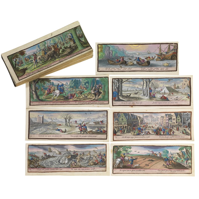 EXTREMELY RARE COPY IN FINE CONTEMPORARY COLOURING of the second edition of the famous series of hunting scenes designed by Hans Bol (1534-1593) and engraved by Philippe Gallé (1537-1612). Series of 43 [of 47] numbered engravings printed on an oblong card measuring approx. 97 x 230 mm. All four edges of the block of engravings are gilt. The ensemble is kept in a modern custom-made light wooden box. - All of the plates have a tiny hole in the upper left corner; some have a small blind stamp depicting a cornucopia and which was not found in www.marquesdecollections.fr, some are a margin shaved; plate 7 has a small hole in the upper margin that it touches the frame, but overall very well preserved. Detailed description and additional images upon request