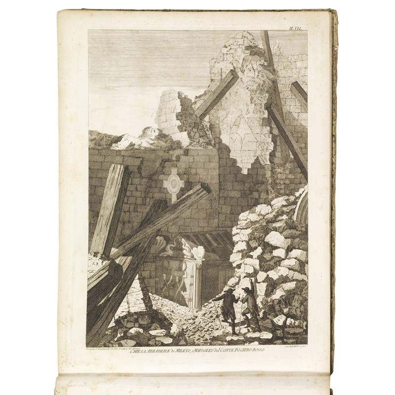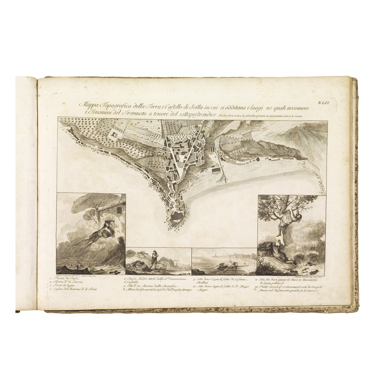 RARO ATLANTE DI TAVOLE che accompagna l’Istoria del Sarconi, illustrando i disastri causati in Calabria dal terremoto del 1783, a seguito del quale si organizzò per la prima volta in Italia una spedizione scientifica nelle zone colpite, oggetto dell’opera del Sarconi. Il terremoto colpì la Calabria e la parte orientale della Sicilia per più di tre anni con diverse scosse, di cui alcune molto forti: morirono più di 30.000 persone, interi villaggi vennero rasi al suolo, crollarono montagne, i fiumi deviarono il loro corso e anche la costa venne ridisegnata. La spedizione iniziò il 5 aprile 1783; l’anno seguente, Giuseppe Campo, commissionato dalla Regia Accademia Napoletana, pubblicò un testo con i resoconti della ricerca condotta da un gruppo di scienziati tra cui lo stesso Michele Sarconi. Le tavole, incise da Antonio Zaballi su disegni di Pompeo Schiantarelli, Bernardino Rulli e Ignazio Stile, illustrano la devastazione dei luoghi terremotati. La tavola finale ritrae invece la “macchina equatoriale” inventata da Padre Eliseo della Conciliazione che servì per disegnare le prima carta sismica mai prodotta in Italia, grazie alla quale vennero corretti gli errori di latitudine e longitudine delle precedenti mappe. Affascinante reportage.