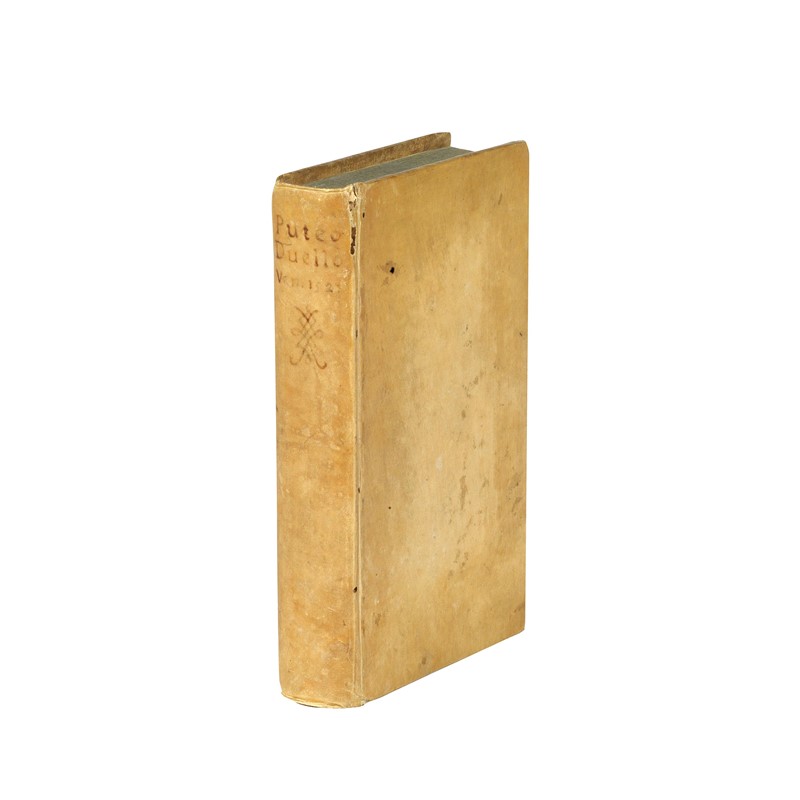 In 8vo piccolo (143 x 82 mm). [200] carte. Xilografia di duellanti al frontespizio, iniziali xilografiche, testo in corsivo. Pergamena rigida settecentesca con titolo anticamente manoscritto al dorso, tagli spruzzati d’azzurro. Ex libris novecentesco di Ludovico de Gobbis. -- Trascurabile mancanza al margine superiore delle carte C1-2 (senza perdite), macchiolina a F8, assente l’ultima bianca, ma nel complesso buona copia genuina.
