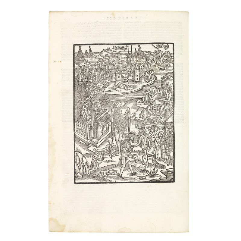 BEAUTIFUL EDITION ILLUSTRATED WITH LARGE XYLOGRAPHS that vividly depict scenes and protagonists of Virgil’s works and in some cases Virgil himself. -- The title page has a restored margin with a small loss, small holes, old signatures written on the front and back. Small worm trails with minimal losses on subsequent leaves, top edge trimmed, some pale water stain, a dark stain at the top corner of two ll., tear on ll. 184 and 345, cut on ll. 204-206, portion of margin removed from ll. 265, 273 359 (without text loss), worm trail in the lower white margin of the 3e-3f quires. Lacks three final ll. 3p2-3p5 with the Priapea, 3p1 and 3p6 restored in the margins and perhaps coming from another copy, ancient annotations on the reverse of the last leaf. Detailed description and additional images upon request.