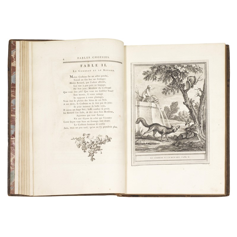 ESEMPLARE MARGINOSO DI QUESTA CELEBRE E MAGNIFICA EDIZIONE DELLE FAVOLE DI LA FONTAINE, uno dei capolavori dell’illustrazione rococò e una delle opere illustrate più famose di tutti i tempi. I quattro volumi contengono, oltre all’antiporta allegorica e al ritratto dell’illustratore, 275 straordinarie tavole calcografiche incise dai migliori intagliatori dell’epoca su disegni di Jean-Baptiste Oudry (1686-1755), pittore, incisore, disegnatore di porcellane e di cartoni d’arazzo, dal 1722 pittore ufficiale delle “caccie reali” di Luigi XV (“Peintre du Roy”). Incantano il realismo con cui sono ritratti gli animali, la bellezza dei paesaggi che fanno da sfondo, la vivacità delle scene, la finezza dei dettagli. Questo esemplare è appartenuto a François Louis Marie Claude Marini, detto “Marin” (1721-1809), è stato un letterato, editore, giornalista e censore reale francese. Voltaire ne riconobbe l’importanza come uomo di lettere, ma lo soprannominò “monstre marin”.