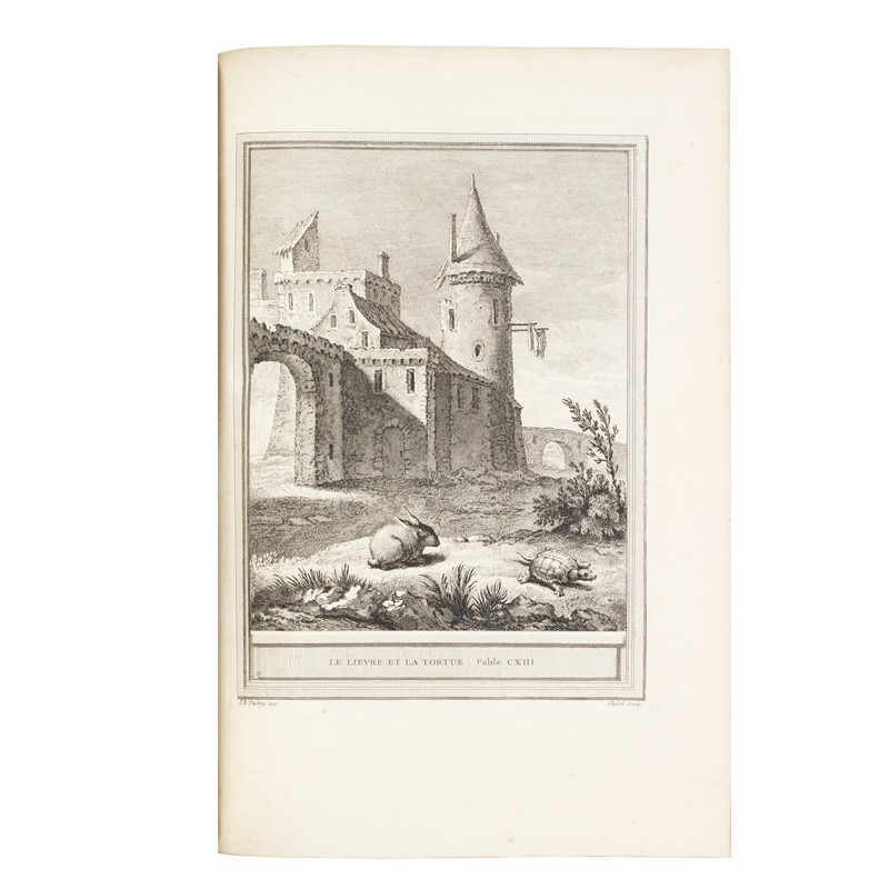 WIDE-MARGINED COPY OF THIS FAMOUS AND MAGNIFICENT EDITION OF LA FONTAINE’S FABLES, one of the masterpieces of Rococo illustration and one of the most famous illustrated works of all time. -- Pale oval stains at the half-title of the first volume and next to the Notice de l’editeur, other oval stamps abraded at the beginning of subsequent volumes, some abrasion and peeling at the binding, occasional browning. Detailed description and additional images upon request.