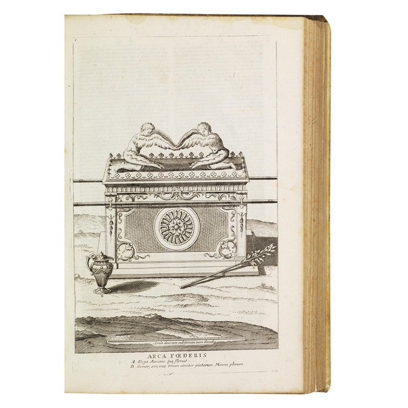 BUONA COPIA DI QUESTO CELEBRE DIZIONARIO DELLE SACRE SCRITTURE, illustrato da 30 tavole calcografiche, tra cui: mappe ripiegate che raffigurano i luoghi visitati dagli apostoli, la Terra Santa, il viaggio e le tappe degli ebrei nel deserto, l’Eden in Armenia, ecc.; oggetti sacri ebraici come l’Arca dell’Alleanza, la Menorah, una serie di tefilim; e poi, abiti sacerdotali, piante (tra cui la mandragora), strumenti musicali, alberi genealogici, divinità pagane, riti, monete ebraiche (4 tavole). Al fine dell’opera si trovano: la “Tabula Cronologica generalis historiae Biblicae” (dalla creazione del mondo nel 4000 a.C. fino al 75 d.C.), e poi tavole di cambio delle monete e misurazioni ebraiche in monete e misurazione francesi e altro, una spiegazione del calendario ebraico, la versione letterale dei nomi ebrei, caldei, siriaci e greci che si trovano nelle Scritture, un indice degli autori e infine una “Dissertatio” sulle tattiche militari ebraiche.