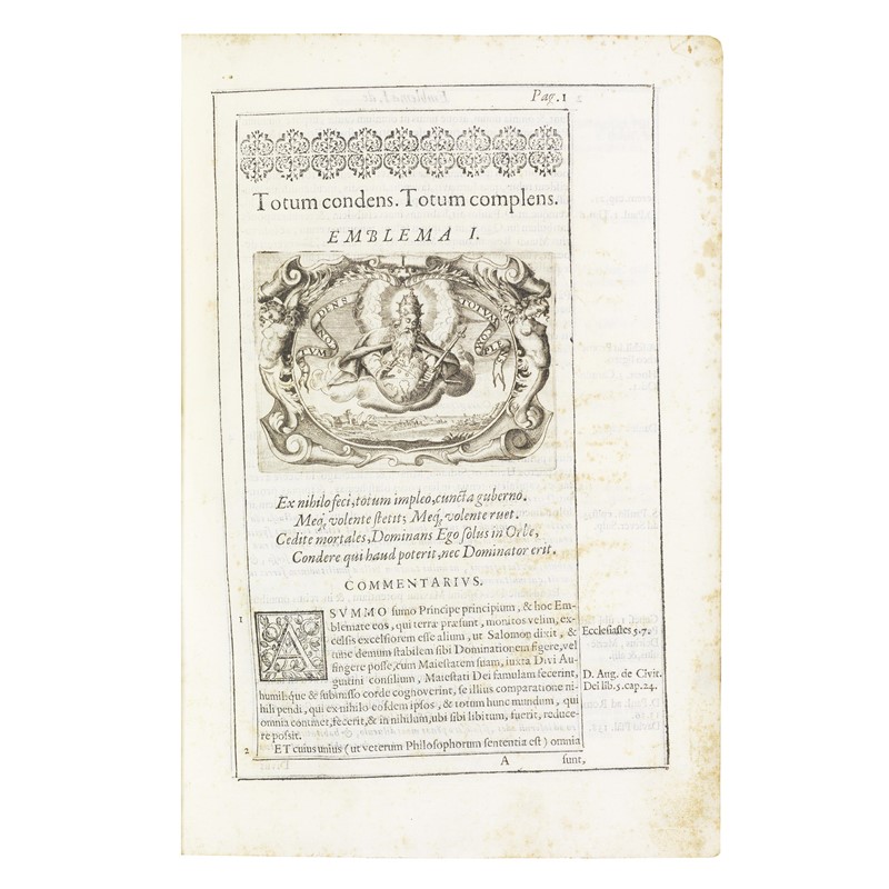 PRIMA EDIZIONE, purtroppo gravemente scompleta, di questa importante opera del giureconsulto Juan de Solórzano y Pereira (1575-1655) che fu il più grande specialista del suo tempo nel “derecho indiano”, parte della legge dedicata ai possedimenti spagnoli in Sud America. Questo libro sintetizzava il pensiero politico dell'autore attraverso 100 emblemi destinati all'edificazione dei principi e incisi su rame dall'orefice fiammingo Robert Cordier (morto nel 1673). L’edizione del 1651 è stata immaginata a partire dalle approvazioni per lo più datate 1651, ma in realtà non esiste: si tratta di esemplari scompleti del frontespizio calcografico.