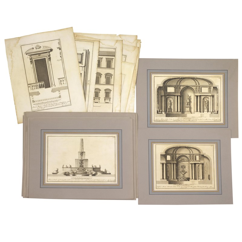 Serie di 20 tavole calcografiche così suddivise: due a doppia pagina (714 x 470) e una più piccola (465 x 365 mm) con facciate; 9 tavole (ca. 470 x 370) con portici, pianta della grotta in fondo a Palazzo Pitti, porta di Palazzo Montalvo, facciata del Palazzo del Marchese Capponi, ecc., più una molto più piccola (378 x 265 mm) con l’arco di Porta San Gallo, e infine 7 tavole simili montate entro passe-par-tout di diverse dimensioni (alcuni scollati). Gore occasionali.
