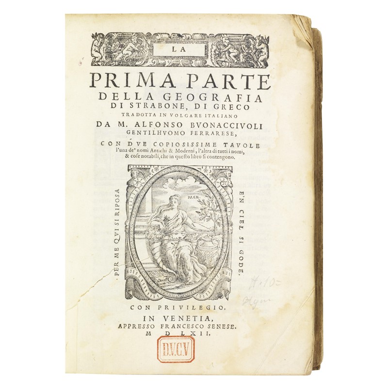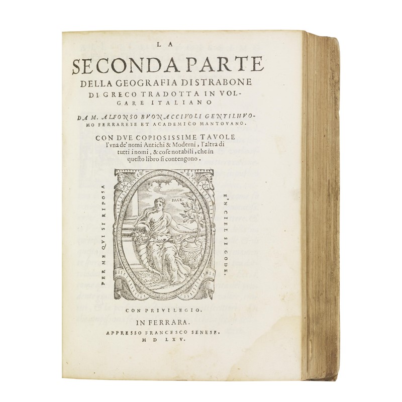 (Geografia) STRABO. La prima parte della Geografia di Strabone […] di greco tradotta in volgare italiano […]. In Venetia, appresso Francesco Senese, 1562. [Legato con:] La seconda parte della Geografia di Strabone di greco tradotta in volgare italiano […]. In Ferrara, appresso Francesco Senese, 1565.