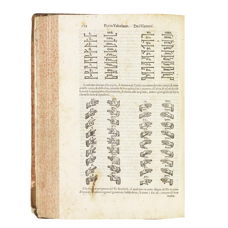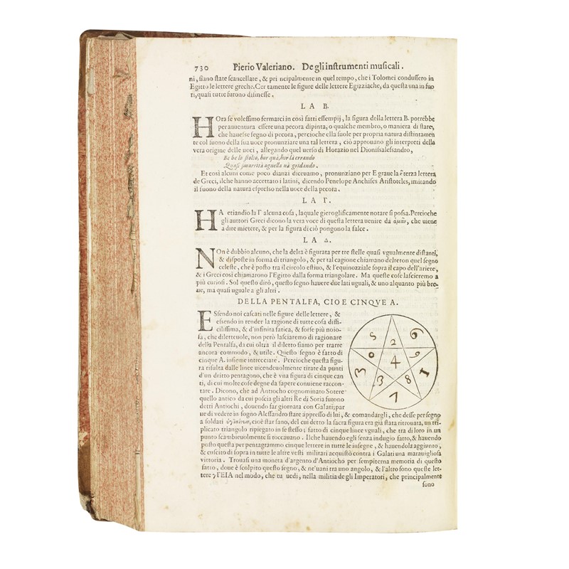 PRIMA EDIZIONE ITALIANA di questa vasta enciclopedia illustrate di fondamentale importanza nell’iconografia tardo-rinascimentale. L’Hieroglyphica di Valeriano è una monumentale raccolta di tutta la conoscenza geroglifica del suo tempo, basata sul trattato di Horus Apollo (pubblicato Manuzio nel 1505), sugli obelischi visti a Roma, sulla Cabala, e sulla Bibbia. Ebbe un tale successo che, dopo la prima del 1556, se ne pubblicarono numerosissime edizioni nei successivi cento anni. L’opera fu anche fonte di immagini emblematiche per gli artisti, e le sue antiche iscrizioni materiale di studio per gli storici umanisti. Il testo è suddiviso in 60 libri, ognuno dei quali descrive e analizza: un animale (leone, elefante, toro, cavallo, cane, babbuino, cervo, formica, maiale, lupo, iena, lepre, volpe, serpente, cicogna, aquila, pellicano, struzzo, api, ecc.) o una parte del corpo, con tutti i significati ad essi attribuiti nei secoli; a partire dal trentasettesimo libro, l’autore riporta le teorie dell’antico Egitto su numeri, lettere, arti divinatorie, varie piante e fiori, ecc.