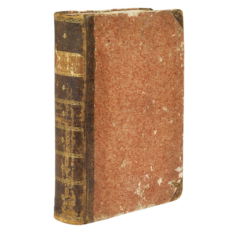 In folio (310 x 215 mm). [xxiv] 919 [1] pp. Numerose vignette xilografiche nel testo. Mezza pelle settecentesca con angoli, dorso liscio con tassello e fregi dorati, tagli spruzzati in rosso. -- Frontespizio e primo fascicolo sciupato e gualcito: in particolare, il frontespizio è risarcito nella parte inferiore con perdita di testo, presenta un foro e numerosi piccoli timbri; alle pagine seguenti compaiono due firme di appartenenza risalenti al Seicento; ricorre accanto ai titoli un timbretto nobiliare; carte A3-A6 con margine esterno lacunoso, X6 (p. 252) con strappo restaurato, galleria di tarlo al margine interno di un paio di fascicoli, margine della carta Iii5 (p. 658) con lacune, qualche occasionale fioritura, brunitura e macchietta.